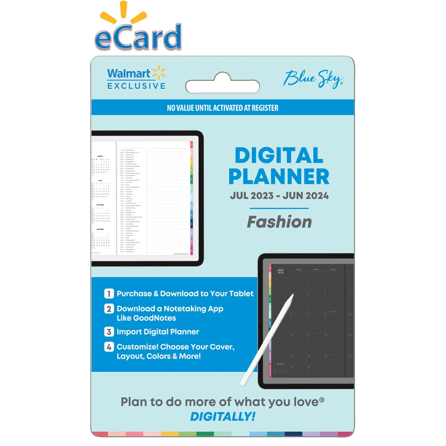We are now entering the next frontier in planning with our latest innovation, the Blue Sky® Digital Planner. Offering our best-selling paper planner layouts in a digital format creates boundless combinations of vertical and horizontal options, as well as endless notes pages and extra content pages. Within your digital planner bundle, you’ll receive a weekly digital planner and monthly digital planner, available in both light and dark modes. Your Professional Digital Planner will also include interchangeable sleek, office-appropriate cover designs and tab colors, as well as productivity-themed digital sticker packs. Created for optimal use on a writable tablet, this paper-free, sustainable planner solution is available exclusively at Walmart and Walmart.com, in both Fashion and Professional options, dated for the academic year from July 2023 to June 2024.